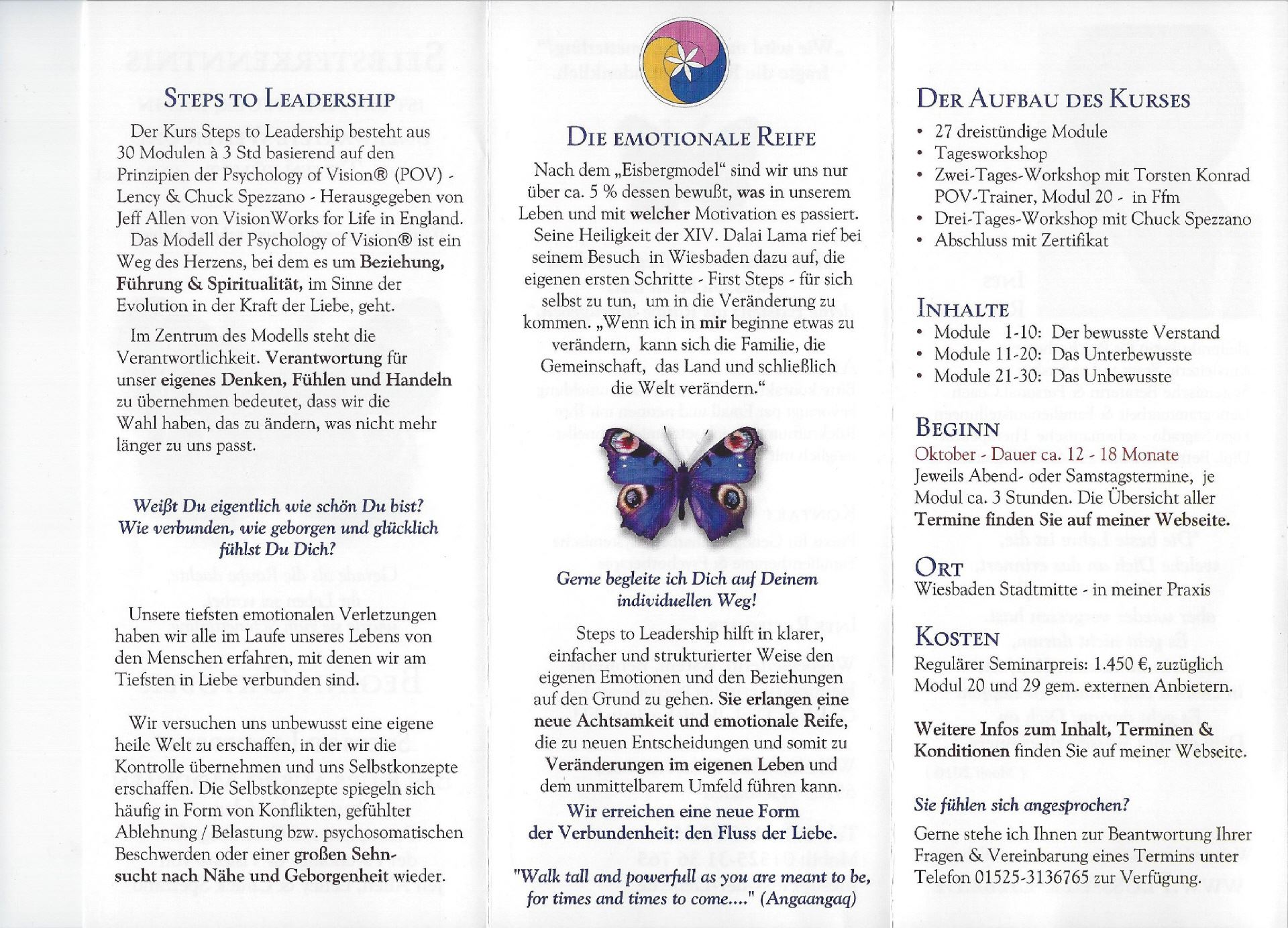 Der Kurs Steps to Leadership besteht aus 30 Modulen à 3 Stunden basierend auf den Prinzipien der Psychology of Vision (POV) - Lency & Chuck Spezzano - Herausgegeben von Jeff Allen von VisionWorks for Life in England.